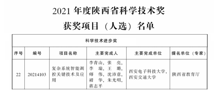 (通讯员 齐富)近日,《陕西省人民政府关于2021年度陕西省科学技术奖励的决定》和《国家知识产权局关于评选第二十三届中国专利奖的通知》发布,由美加墨世界杯官方网站李青山教授牵头的项目“复杂系统智能调控关键技术及应用”荣获陕西省科学技术进步奖二等奖,沈玉龙教授团队的发明专利“一种多域分层的多域物联网平台及多域管理方法”预获中国专利优秀奖,是公司唯一入选本届中国专利奖的专利。