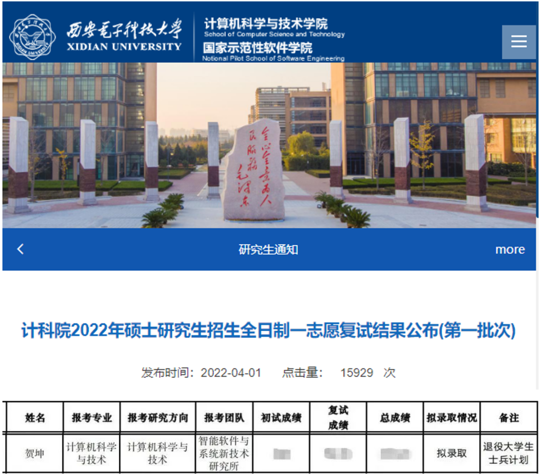 (图文来源美加墨世界杯官网新闻网)人间最美四月天,在西电退伍老员工士兵群体里传来好消息,贺坤同学通过“硕士研究生招生退役士兵专项计划”被美加墨世界杯官方网站拟录取。