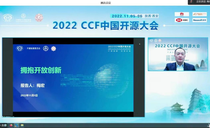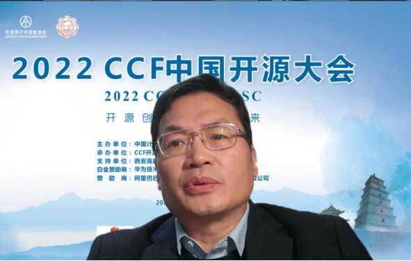 开幕式由大会主席、CCF开源发展委员会主任、王怀民院士主持。王怀民院士指出本届大会是CCF开源发展委员会成立之后的首届大会,具有重要的标志性意义。面对举办地出现疫情等不可控因素,组委会全力以赴、及时部署线上参会方案,并提供多种参会渠道,尽最大努力为参会代表呈现一场高质量的开源盛会,保障全体代表的参会体验。王怀民院士希望大家在两天的时间里,积极参与报告讨论,广泛传播大会影响,使大会成为推动开源生态发展与开源模式创新的平台。