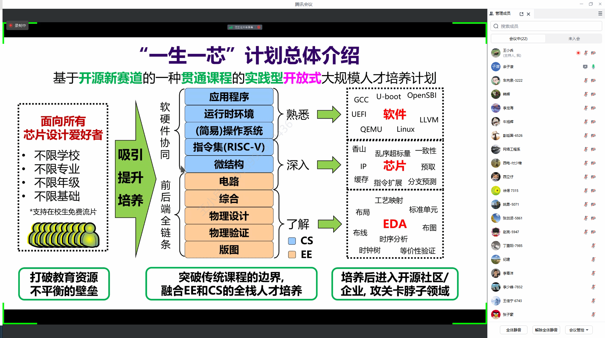 此次分享会展示了“一生一芯”计划在推动开源处理器芯片设计教学与实践中的重要作用,为公司实施“一生一系统”计划提供了宝贵经验,有助于提升计算机拔尖员工的计算机系统综合能力。
