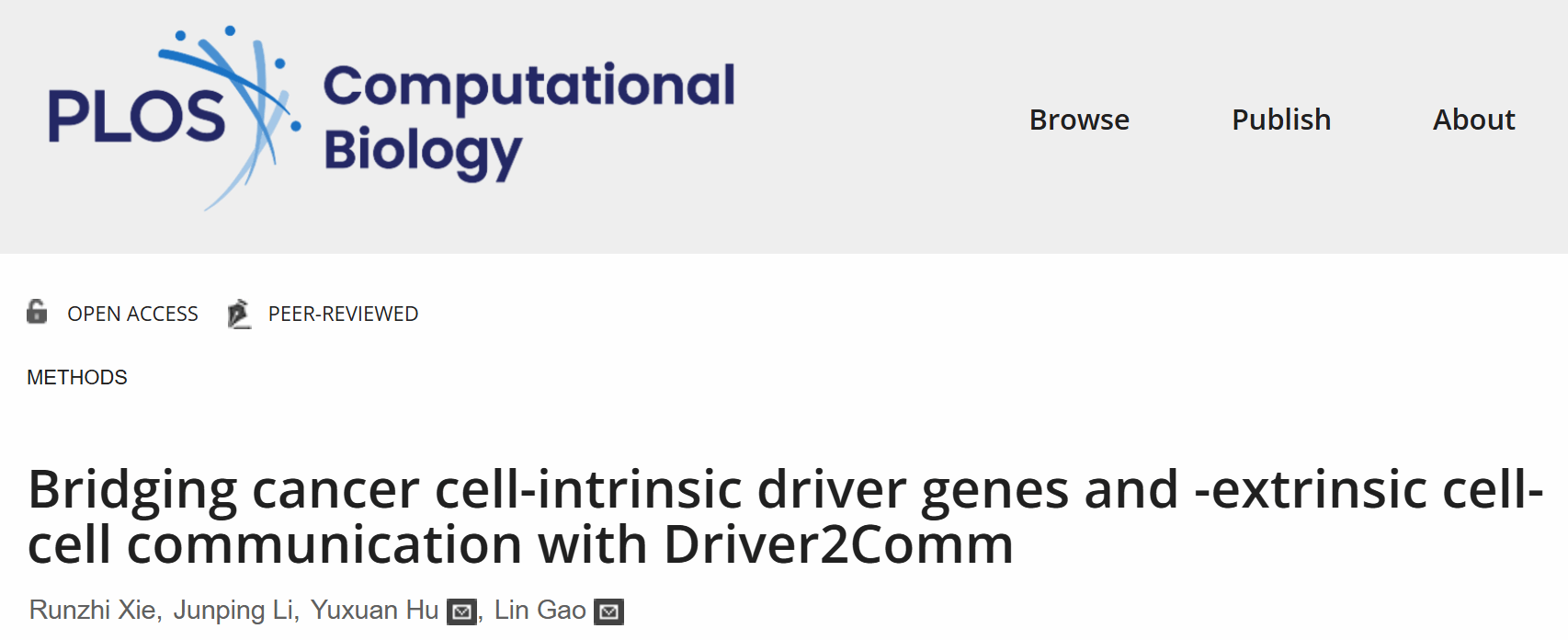 2026年2月17日,高琳教授/胡宇轩教授团队的另一项原创性成果 “Bridging cancer cell-intrinsic driver genes and -extrinsic cell-cell communication with Driver2Comm” 在领域著名期刊《PLOS Computational Biology》发表,美加墨世界杯官方网站博士生谢润志为论文第一作者,美加墨世界杯官网为第一单位。
