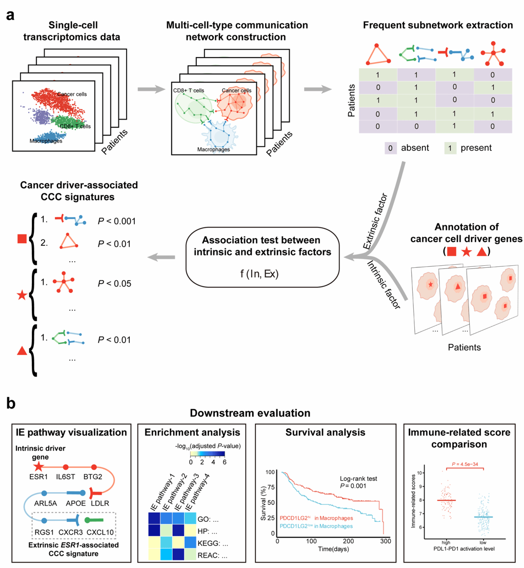 肿瘤的发生发展不仅受到癌细胞内部遗传变异(如驱动基因突变)的影响,还与肿瘤微环境中不同细胞之间的相互作用密切相关。然而,癌细胞内部遗传变异与外部细胞通讯之间如何协同作用,目前仍缺乏系统性的计算分析框架。