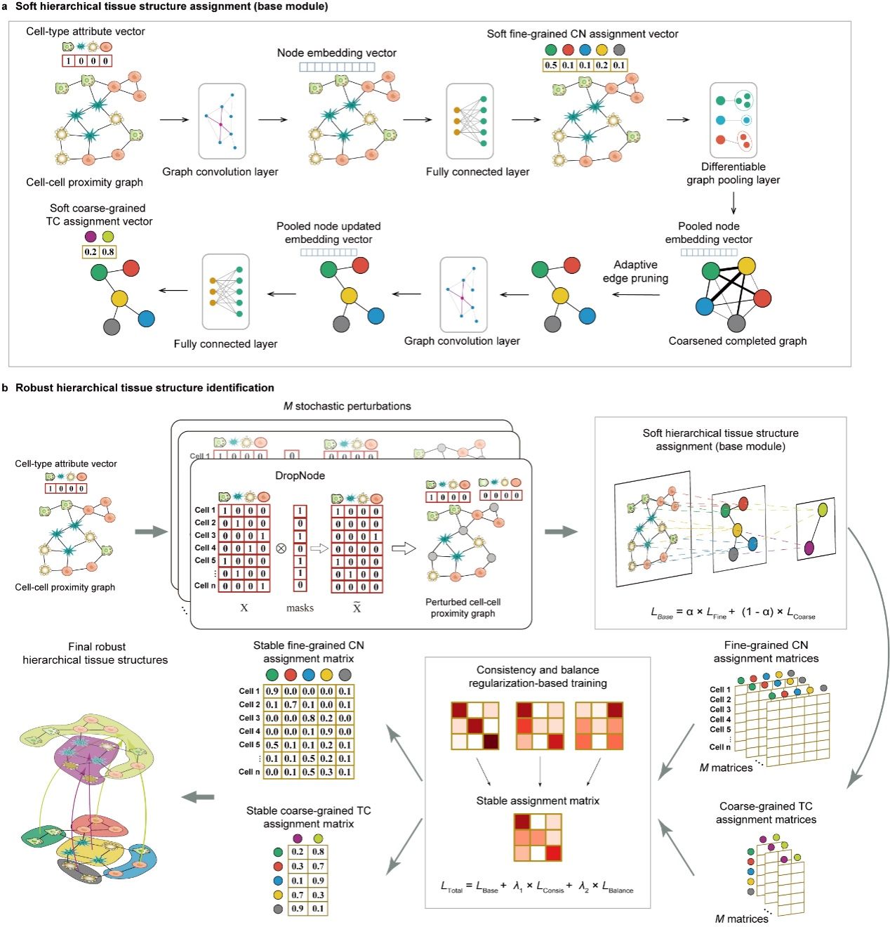 针对这一问题,研究团队提出了一种基于图神经网络的空间组学分析框架 HRCHY-CytoCommunity。该方法将组织层级结构识别问题建模为图中层级社区发现(hierarchical community detection)问题,并结合图卷积网络与可微分图池化技术,实现从“单个细胞→细胞邻域→组织区室”的多尺度组织结构系统解析。