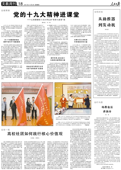 “问题一,党的十九大关键词有哪些?”紧跟时事,郑晓静用关于十九大报告的这一问题开启了这堂课。走下讲台,她用鼓励的目光看着前排同学,希望他们踊跃展现自己对十九大报告精神的领会和思考。