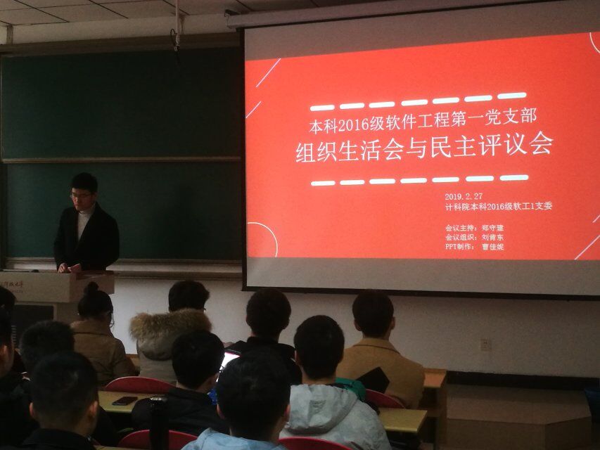 (通讯员 曹佳妮)为深入学习贯彻习近平新时代中国特色社会主义思想,严格执行党的组织生活制度,增强党内政治生活的政治性、时代性、原则性、战斗性,按照公司党委关于基层党支部组织生活会和开展民主评议党员工作的要求和部署,计科院本科2016级软件工程第一党支部于2019年2月27日下午在信远117教室,围绕学习贯彻习近平新时代中国特色社会主义思想,树牢“四个意识”,坚定“四个自信”,做到“两个维护”为主题召开支部党员组织生活会和开展党员民主测评。支部书记郑守建主持本次会议,全体正式党员和预备党员参加了会议。
