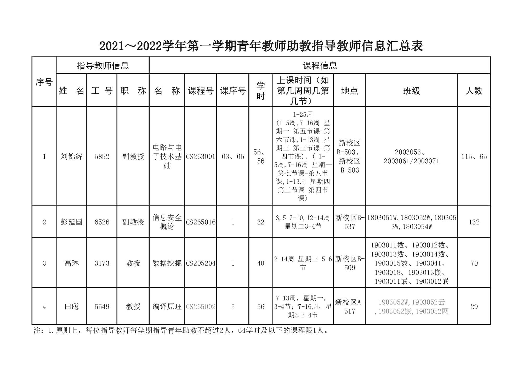 2021~2022学年第一学期青年教师助教指导教师信息汇总表