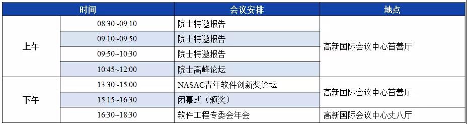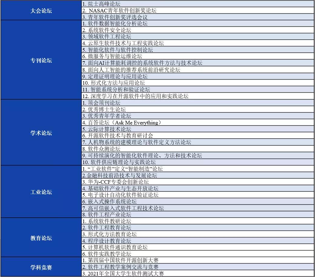 2021CCF中国软件大会将组织特邀报告、院士高峰论坛、青年学者论坛、论文专刊论坛、顶会顶刊论坛、学术论坛、工业论坛、教育论坛、学科竞赛答辩和软件研究成果展示等30余个不同类型的活动。大会将邀请10余位软件及相关领域中国科公司院士与中国工程院院士,为大会带来特邀报告并参加院士高峰论坛等活动。目前已邀请参会的两院院士包括中国科公司院士林惠民,中国科公司院士陶文铨,中国科公司院士梅宏,中国科公司院士吕建,中国科公司院士李应红,中国工程院院士廖湘科,中国科公司院士杨孟飞,中国科公司院士管晓宏,中国科公司院士王怀民,中国科公司院士冯登国,中国工程院院士孙凝晖等。