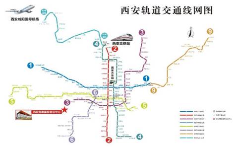 2)公共交通:机场大巴城西客运站线——到达城西客运站下车——城西客运站乘坐公交272路/186路——到达西三环天谷六路站下车——步行约787米,约12分钟到达西安高新国际会议中心,全程约1小时50分钟。