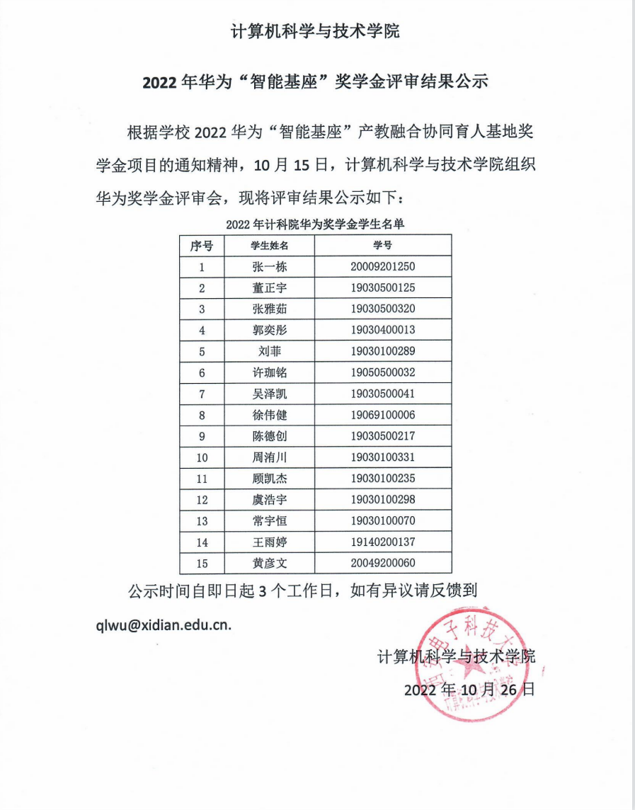 美加墨世界杯官方网站2022年华为“智能基座”奖学金评审结果公示