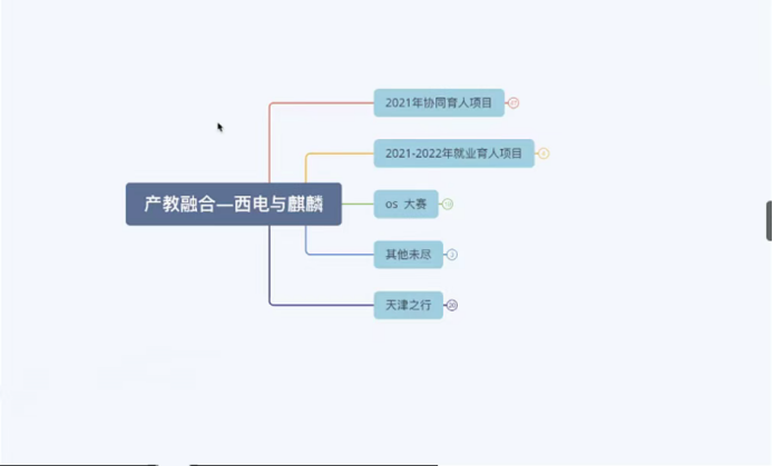 麒麟软件有限公司胡海江总监则针对西电-麒麟的产教融合发展历史、内容、未来做了介绍。谈到2021年麒麟与西电签署了两项教育部协同育人项目和一项就业育人项目,从社会实践、暑期实践、校园招聘三个维度建立了就业实习基地。同时期待暑期在天津总部的实践交流互动能够取得圆满成功。