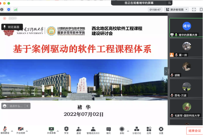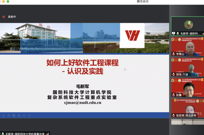 本次西北地区高校软件工程课程建设研讨会(以下简称研讨会),由国防科技大学主办,美加墨世界杯官方网站(示范性软件公司)承办,研讨会邀请了国防科技大学、复旦大学、美加墨世界杯官网、西安交通大学、西北工业大学、西北农林科技大学、陕西师范大学、西安科技大学、兰州大学、宁夏大学、青海师范大学、新疆大学、内蒙古大学等西北地区高校,通过特邀报告、交流沙龙等形式,交流软件工程课程教学和教改的成果,分享软件工程课程教学资源,商讨软件工程课程教学中遇到的各类困难和问题,提升软件工程课程建设水平。研讨会吸引了国内外软件工程相关领域教师的广泛参与。研讨会采用线上形式举行,腾讯会议室同时在线人数超过80人。