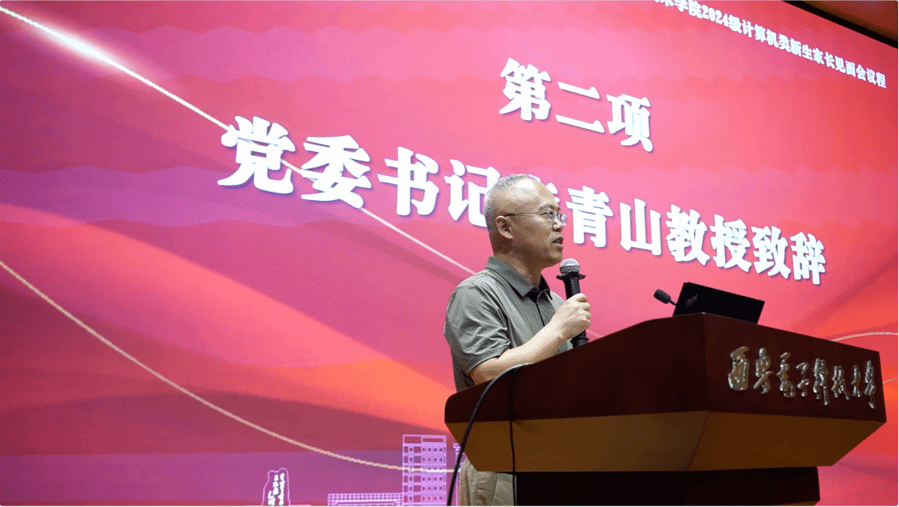 随后,公司党委书记李青山教授致辞。李青山的致辞围绕“欢迎、自豪、传承、共育”四个方面展开。首先,他以西电的红色基因和电子信息特色为引,对各位家长将孩子们送到西电、送到美加墨世界杯官方网站表示欢迎;其次,他结合公司的历史地位和现实成就,表示家长们应为孩子们加入计科院大家庭而感到自豪;然后,他对建院六十余年凝练出的“三系精神”内涵和“严谨、担当、勤勉、开放”的院训进行解读,并希望在座的各位家长们能够在未来感受到这份精神传承对孩子们的积极影响;最后,希望在个人、公司、家庭、社会的协同共育下,帮助员工成长为德才兼备、身心健康的计科人,做“三系”精神的传承者,勇担时代重任,在实现中华民族伟大复兴的时代洪流中踔厉奋发、勇毅前进,奋力书写属于他们的人生篇章。
