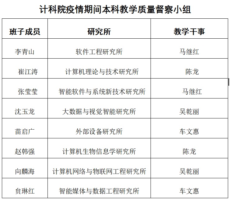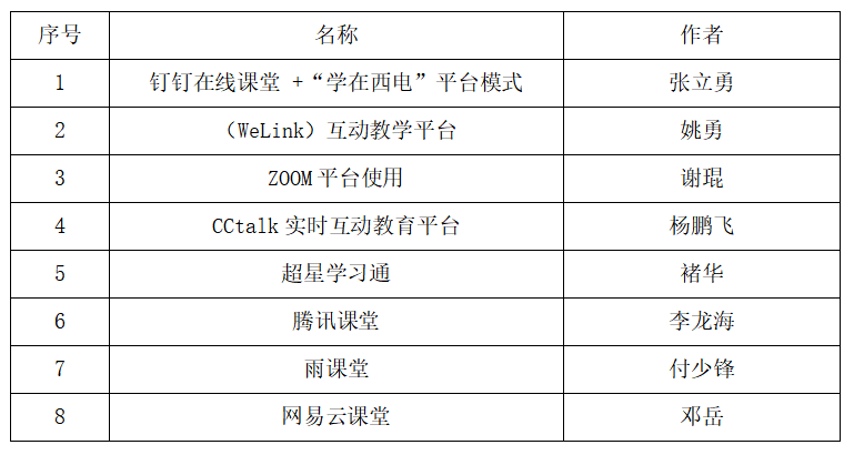 暖校举措,众志成城。在软件工程系主任宋胜利教授的组织下,由公司付少锋、邓岳、褚华、李龙海、张立勇、谢琨、杨鹏飞、姚勇等8位老师分别对多个主流互动教学平台进行测试,形成测试分析报告,分享平台使用文档及实操视频,并分享给其他公司老师,被公司采用,积极为公司贡献计科院力量,让公司学子深刻感受到公司丰富的线上教学资源,多层次的教学手段,灵活运用的信息化技术。