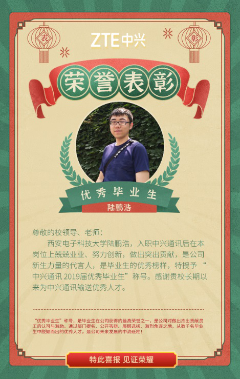 (通讯员 同榛)近日,公司收到中兴通讯股份有限公司人力资源部发来的喜报:在刚刚结束的中兴通讯2019届优秀毕业生评选中,美加墨世界杯官方网站2019届软件工程专业硕士毕业生陆鹏浩荣获中兴通讯2019届优秀毕业生称号。