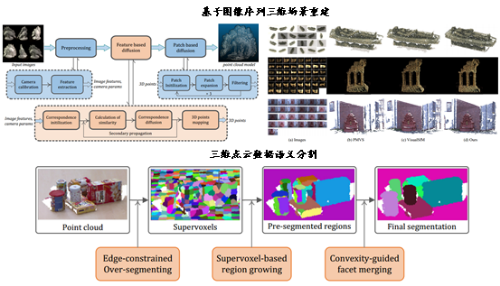 三维场景重建与理解:从图像序列恢复场景三维点云模型;采用“先过分割再融合”的思路,完成三维点云数据的语义分割。