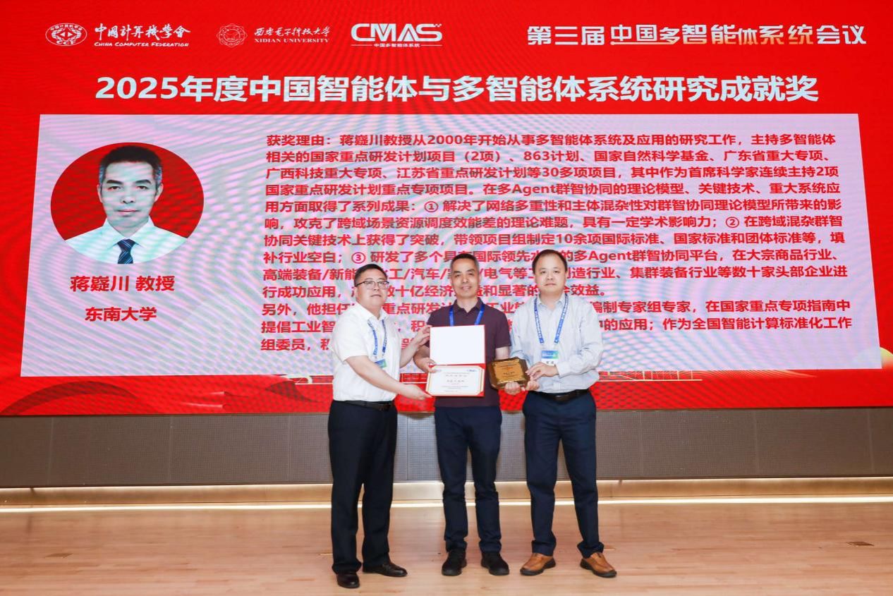 首先颁发中国智能体与多智能体系统研究成就奖(2025),获奖人员包括东南大学蒋嶷川教授。