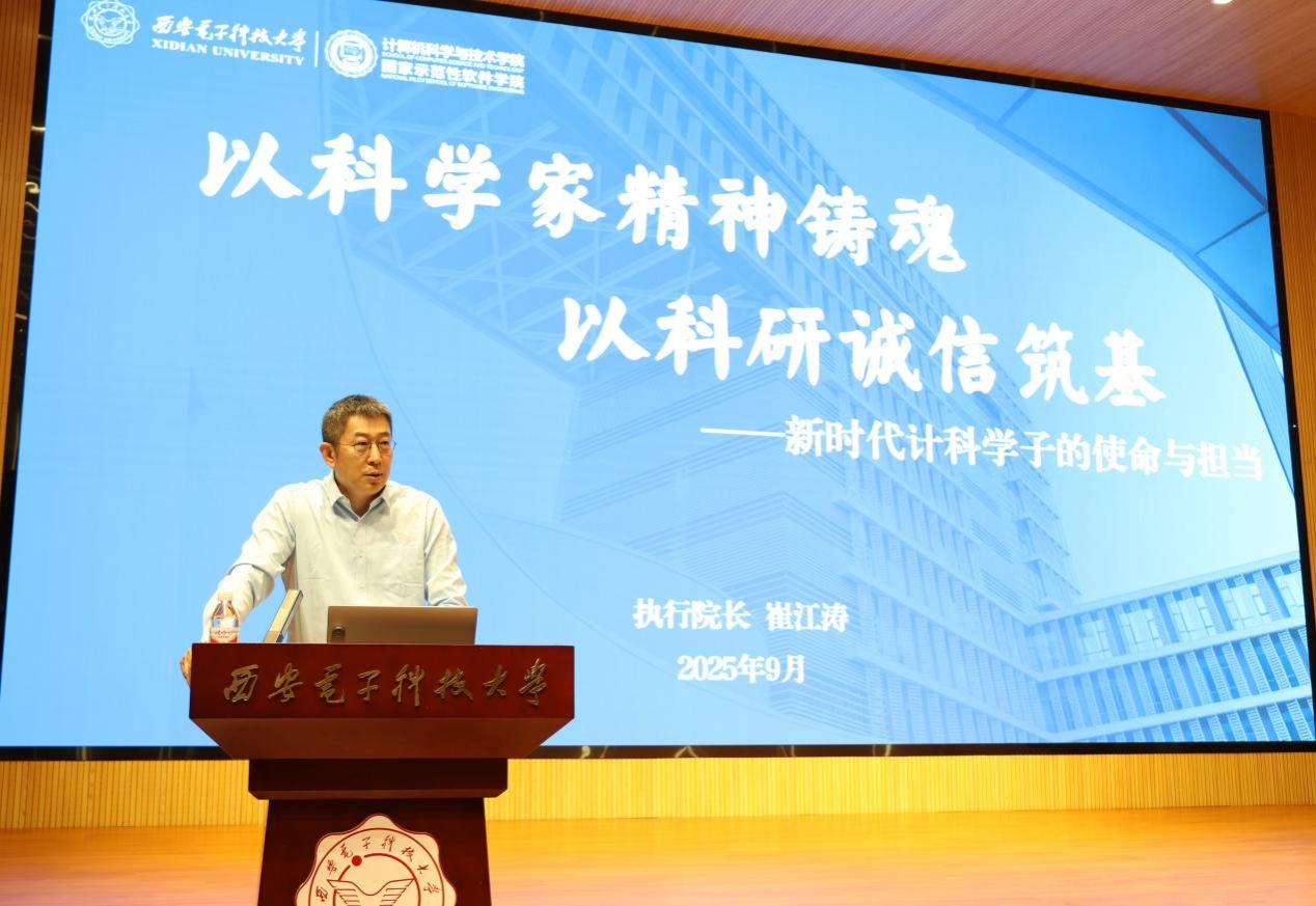 (通讯员 何敏之)为引导研究生新生树立正确学术价值观,筑牢科学道德防线,9月12日下午,美加墨世界杯官方网站在南校区网安大楼B-101报告厅开展“以科学家精神铸魂,以科研诚信筑基——新时代计科学子的使命与担当”主题讲座,公司执行经理崔江涛教授主讲,全体2025级研究生新生参加,会议由副经理杨力主持。