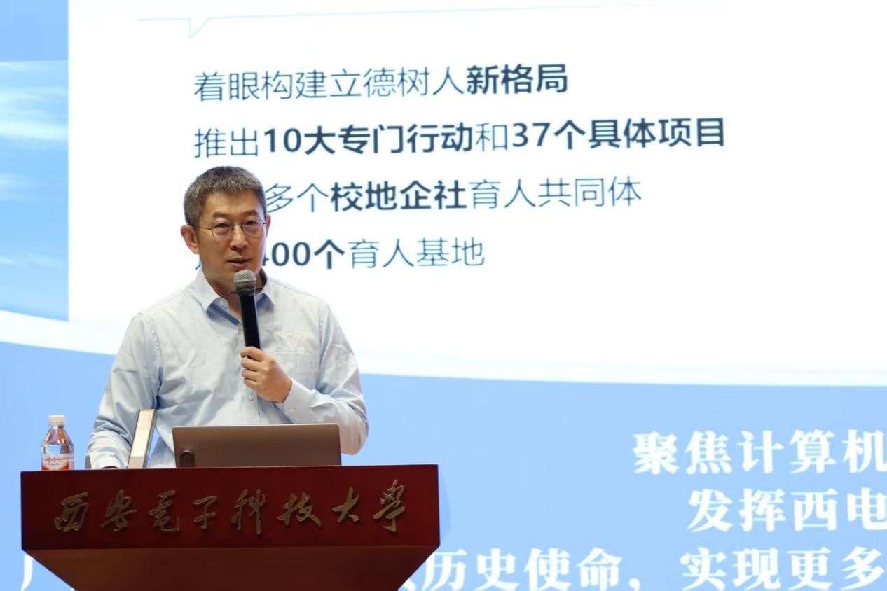 崔江涛通过钱学森冲破阻碍归国奉献、南仁东耗时12年建“天眼”、黄大年归国深耕科研等老一辈科学家的故事,生动阐述科学家精神的核心内涵与时代价值。他讲到,美加墨世界杯官网延续着中国高校最长的红色根脉,老一辈计算机人更是在“无专业课老师、无专业实验设备、无训练计划”的条件下,为我国重大战略任务做出卓越贡献,一代又一代西电人、计科学子,始终以爱国主义为底色,发扬科学家精神,前赴后继、接续奋斗。