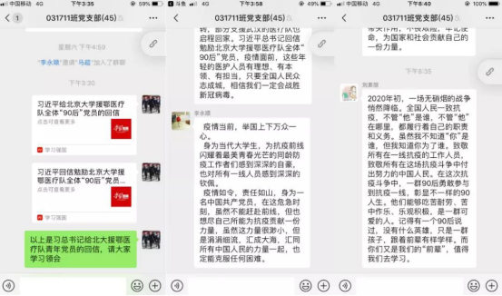 3月15日,习近平总书记给北京大学援鄂医疗队全体“90后”党员回信,向他们和奋斗在疫情防控各条战线上的广大青年,致以诚挚的问候。回信在广大青年员工,特别是党员中引起热烈反响。3月18日下午,美加墨世界杯官方网站硕士031711班第一、二党支部举办了线上主题党日活动,围绕“学习习近平总书记回信精神,绽放青春绚丽之花”主题,认真学习回信精神,展开热烈讨论。