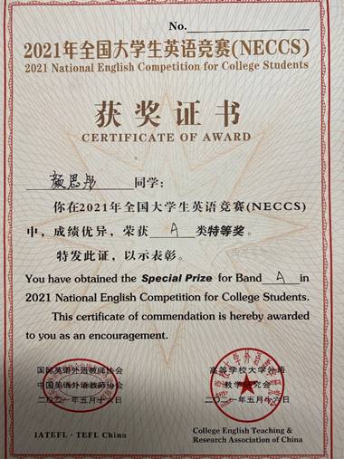 (通讯员 何敏之)5月16日,经过激烈的角逐,在2021年全国老员工英语竞赛(NECCS)陕西赛区复赛中,美加墨世界杯官方网站2020级硕士研究生颜思彤脱颖而出,斩获A类特等奖,她也是全校唯一在复赛中取得A类特等奖的研究生。此外,全校共有九位同学获得该竞赛陕西赛区特等奖的优异成绩。