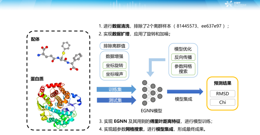为解决赛题药物分子蛋白结合能力预测问题,该团队以基于傅立叶编码距离特征的等变图网络EGNN模型为基础,设计基于人工智能的药物分子蛋白结合能力打分函数。该方法大大提高了药物筛选的准确率和效率,有利于降低药物研发成本,增强国产新药在国际市场上的竞争力,具有较强的工程化能力和广阔的潜在应用场景,赋能医药产业,实现技术创新。