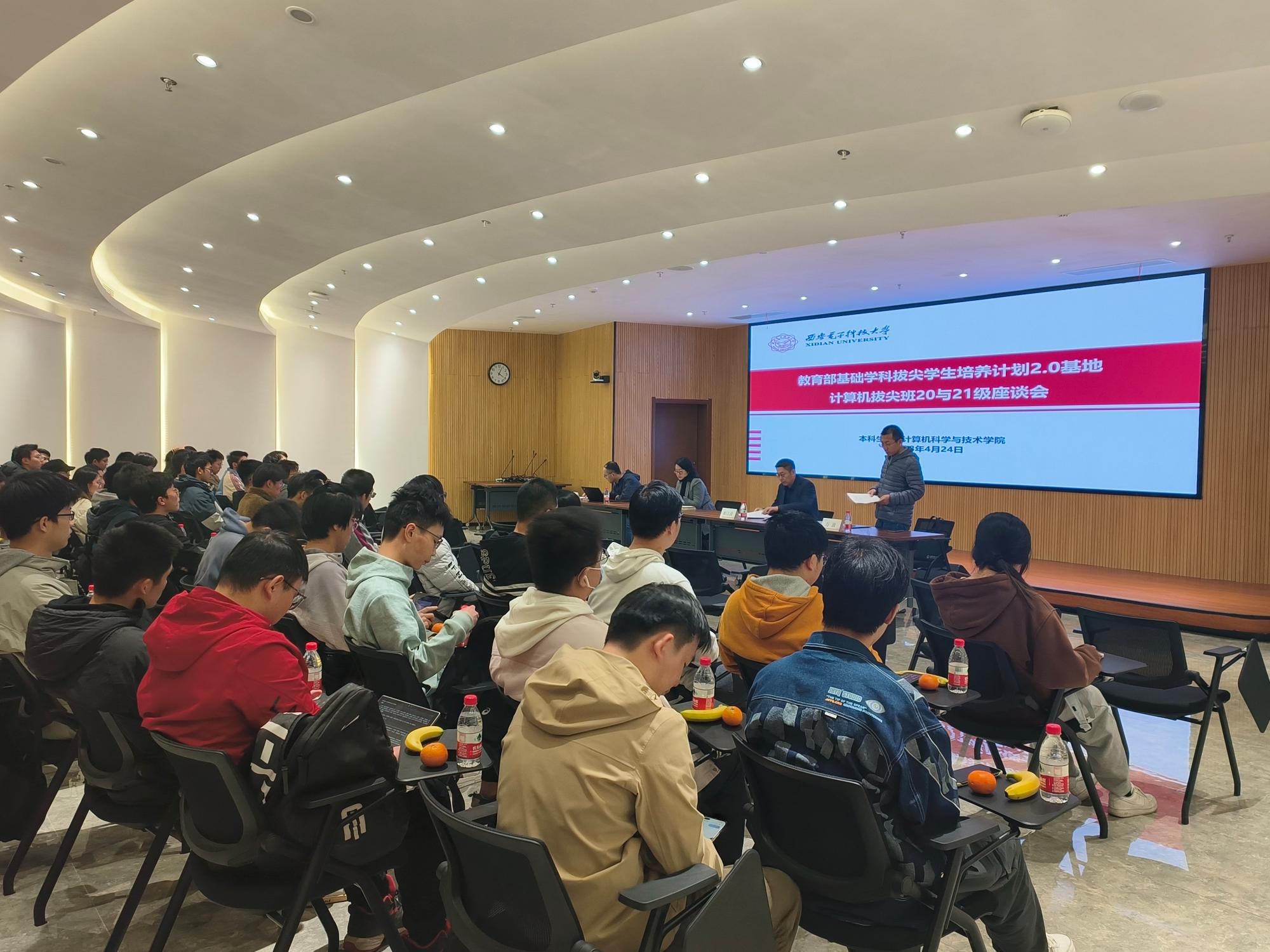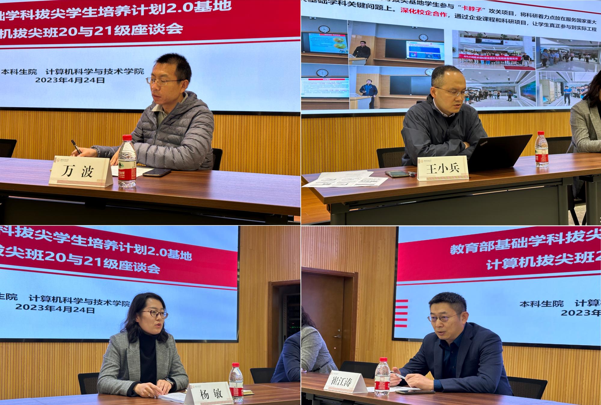 (通讯员 王小兵)为贯彻落实“全面提高人才自主培养质量,着力造就拔尖创新人才”二十大精神,根据公司第十三次党代会拔尖创新人才培养工作部署,4月24日下午4点,计算机拔尖班2020级与2021级员工座谈会在南校区网安大楼会议中心103报告厅召开。本科生院副处长杨敏,美加墨世界杯官方网站执行经理崔江涛,副经理万波,计算机拔尖班负责人王小兵参加。本次座谈会由美加墨世界杯官方网站与本科生院共同举办,旨在深入调研拔尖班特性需求,全面落实立德树人根本任务,推进公司拔尖创新人才培养工作,提高人才自主培养质量,打造“不设天花板”的拔尖人才培养空间。