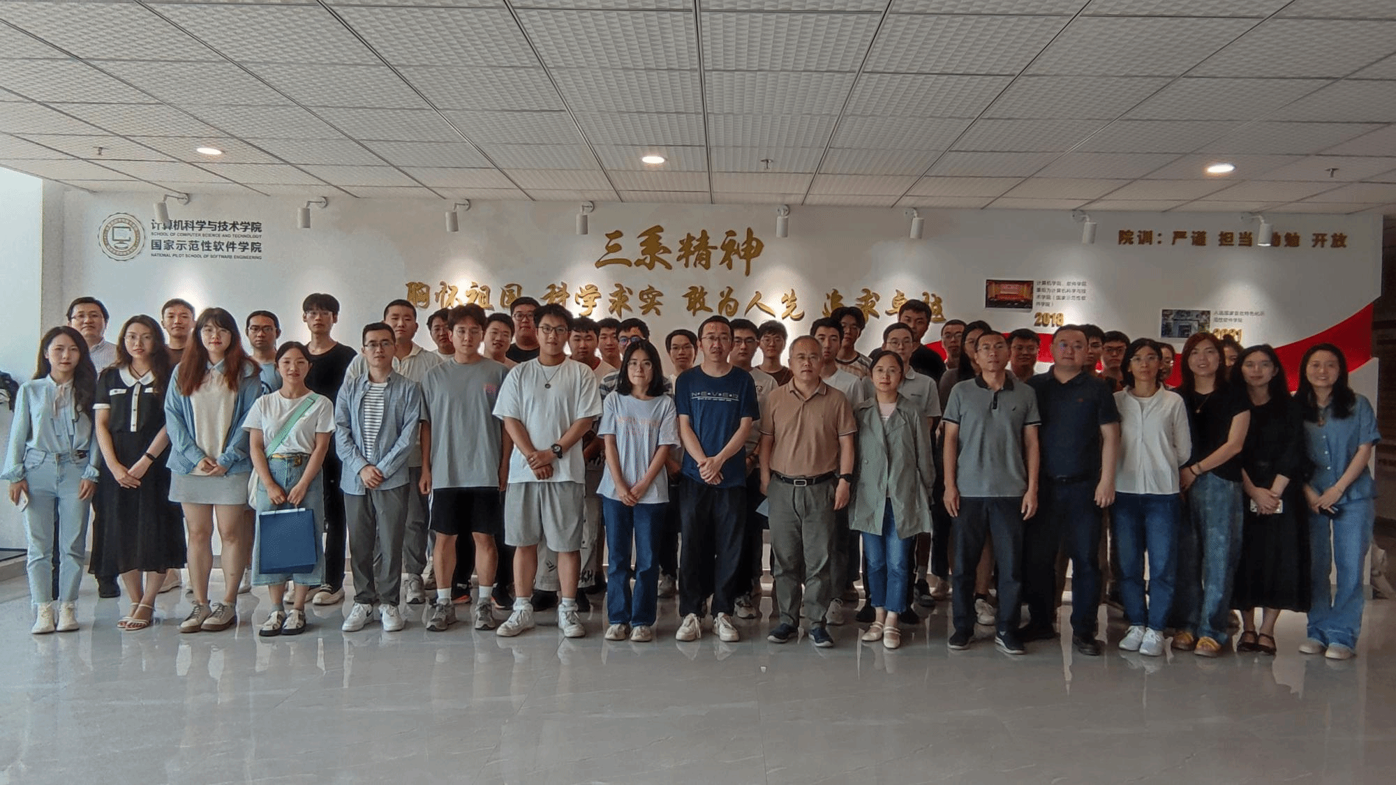 会后,与会师生在“三系精神”公司文化墙前共同合影留念。