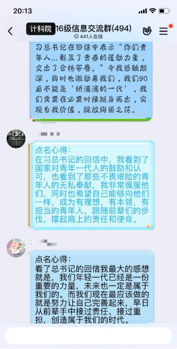 主题点名之后同学们感触良多,本科2017级员工在点名之后纷纷就总书记回信内容撰写心得体会,表达对西藏大学医公司员工以及援鄂医疗队的敬佩之情。本科2016级员工在班群、年级群中就总书记回信内容、就业择业问题开展了积极的讨论,同学们踊跃发言,气氛热烈,纷纷表达自身所思所悟,坚定了为祖国贡献力量的决心。