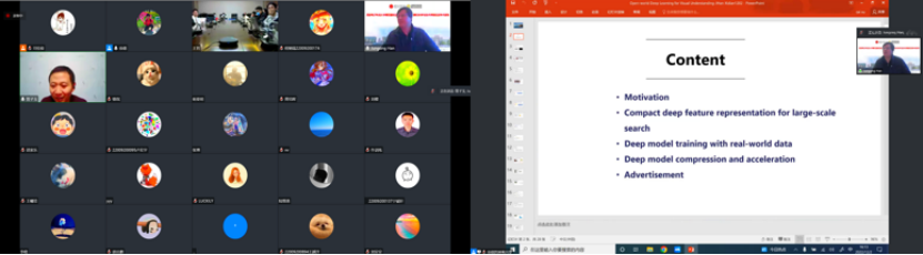 韩军功教授的报告主题为“Open World Deep Learning for Visual Understanding”,报告首先分析了在现实场景中进行全监督学习的挑战;之后,韩教授针对这些问题,分享了自己团队近年来在大规模数据深度哈希检索、半监督深度学习、深度模型压缩与加速等领域进行的研究情况;同时他对该领域未来的研究方向进行了展望。学术报告部分结束后,韩军功教授与参会师生连线进行深入的交流研讨,并对师生关心的问题进行了耐心详细的解答。