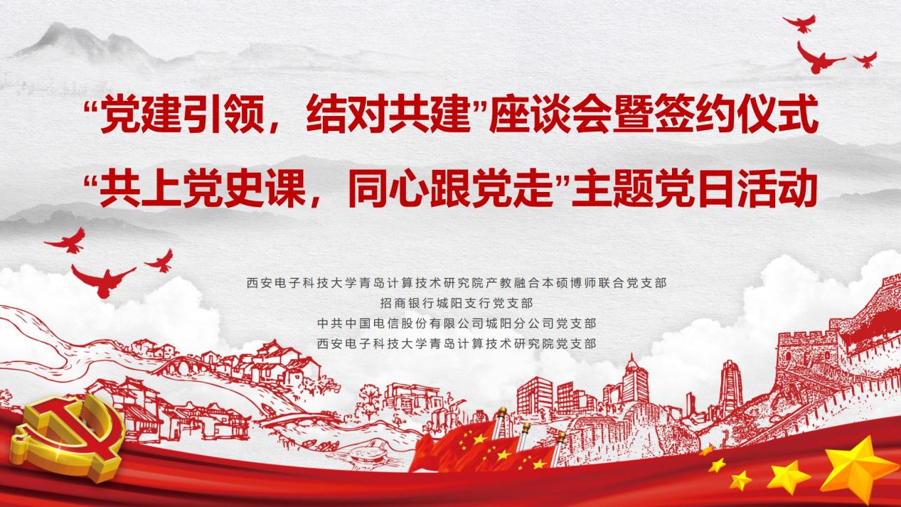 4月23日下午,党支部共建各方代表齐聚西电青岛研究院,共同举办合作共建签约仪式暨“共上党史课,同心跟党走”主题党日活动。西电公司党委副书记、党委委员、纪委书记张莹莹,西电青岛计算技术研究院产教融合本硕博师联合党支部书记、计科公司党委委员向麟海,西电计科院团委书记李栋,辅导员党支部书记梁双杰,党建与员工工作办公室主任同榛,中共中国电信股份有限公司城阳分公司党支部书记、总经理刘祖洺,党支部纪委委员、副总经理赵腾,招商银行城阳支行副行长、工会主席、支部委员会纪检委员李苹苹,西电青岛计算技术研究公司党支部书记王建东参加了座谈会。会上,各党支部代表分别介绍了党支部的基本情况,同时以“党建引领,结对共建”为主题展开深入交流,并就工作目标达成一致意见:今后各方要共筑组织基础、共促队伍建设、共办实事好事,通过搭建党建学习活动平台、分享工作资源、交流工作经验、解决实际问题等途径,实现党的建设与公司、企业发展良性互动。
