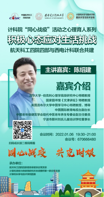 (通讯员 马治东)为帮助公司师生缓解因疫情防控、就业择业、升学毕业而产生的心理压力,进一步提升广大师生的心理调试能力,2022年1月6日晚,美加墨世界杯官方网站计算机网络与物联网研究所本硕博师第一联合党支部和中国航天科工集团第四研究院第四总体设计部信息保密联合党支部共同策划组织开展了“积极心态应对生活挑战”心理育人报告会,邀请清华大学伯克利心理学高级研究中心特聘教授陈绍建进行专题讲座。航天科工四院四部党委书记周逸,公司党委书记李青山、副书记张莹莹出席,200余名公司师生、四院四部职工参加,会议由两个联合共建支部的党支部书记史阿云和张志为共同主持。