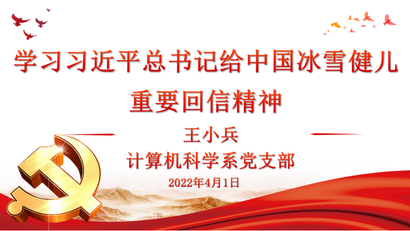 (通讯员 李晓)2022年2月4日至2月20日,面对肆虐的新冠肺炎疫情,第24届冬季奥林匹克运动会在北京成功举行,中国冰雪健儿取得了9金4银2铜的优异成绩,位于金牌榜第三,极大的振奋了民族自豪感。4月1日晚8点,计算机科学系教师党支部在线开展“学习习近平总书记给中国冰雪健儿的重要回信精神”的主题党日活动。活动由支部书记王小兵主持,共有19名支部党员参加。