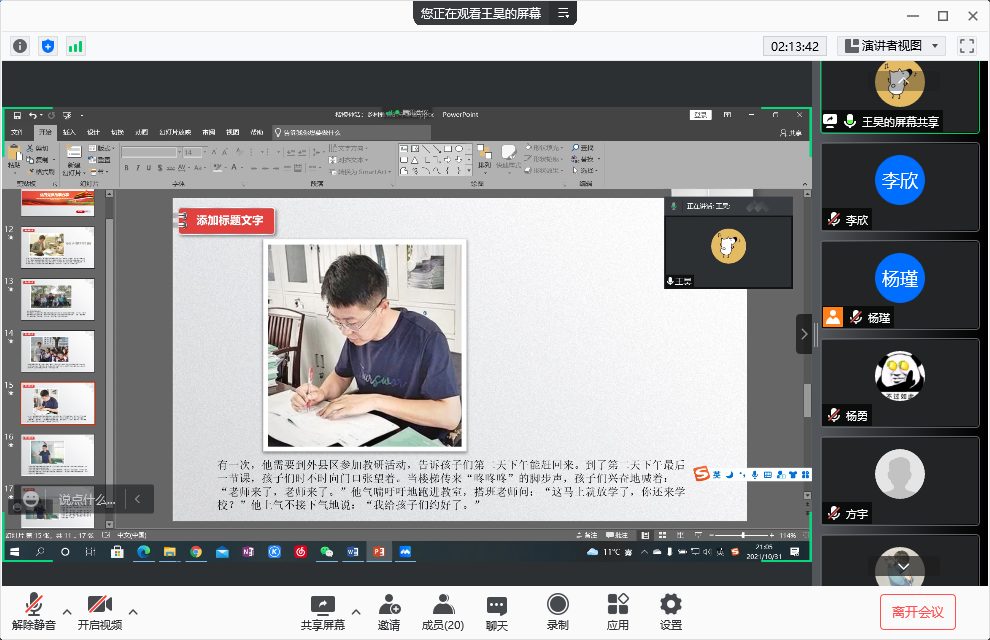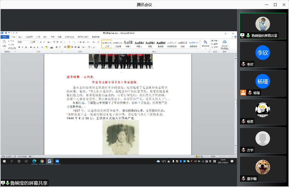 随后,支部党员同志分享了校内外优秀党员先锋模范的故事。马国臣分享了人民楷模老兵朱彦夫抗美援朝的故事,胡雅宣分享了老员工村官刘亚妮的故事,李欣分享了全国优秀共产党员王涛带领村民致富的故事,康宇翰分享了57岁洪山下沉党员肖红华的下沉故事,高向阳追忆了特级战斗英雄杨根思,方宇为大家介绍了永葆党员初心的军人张连印,支部副书记杨瑾为大家带来了冲锋在一线的反诈尖兵康飞的故事,邸维高分享了全国模范法官杨军的故事,杨勇讲述了回村当农民的开国将军—甘祖昌的故事……故事中的党员同志们在他们自己的岗位上发挥着自己的光和热,他们的精神深深的感动和激励了支部的党员同志们。