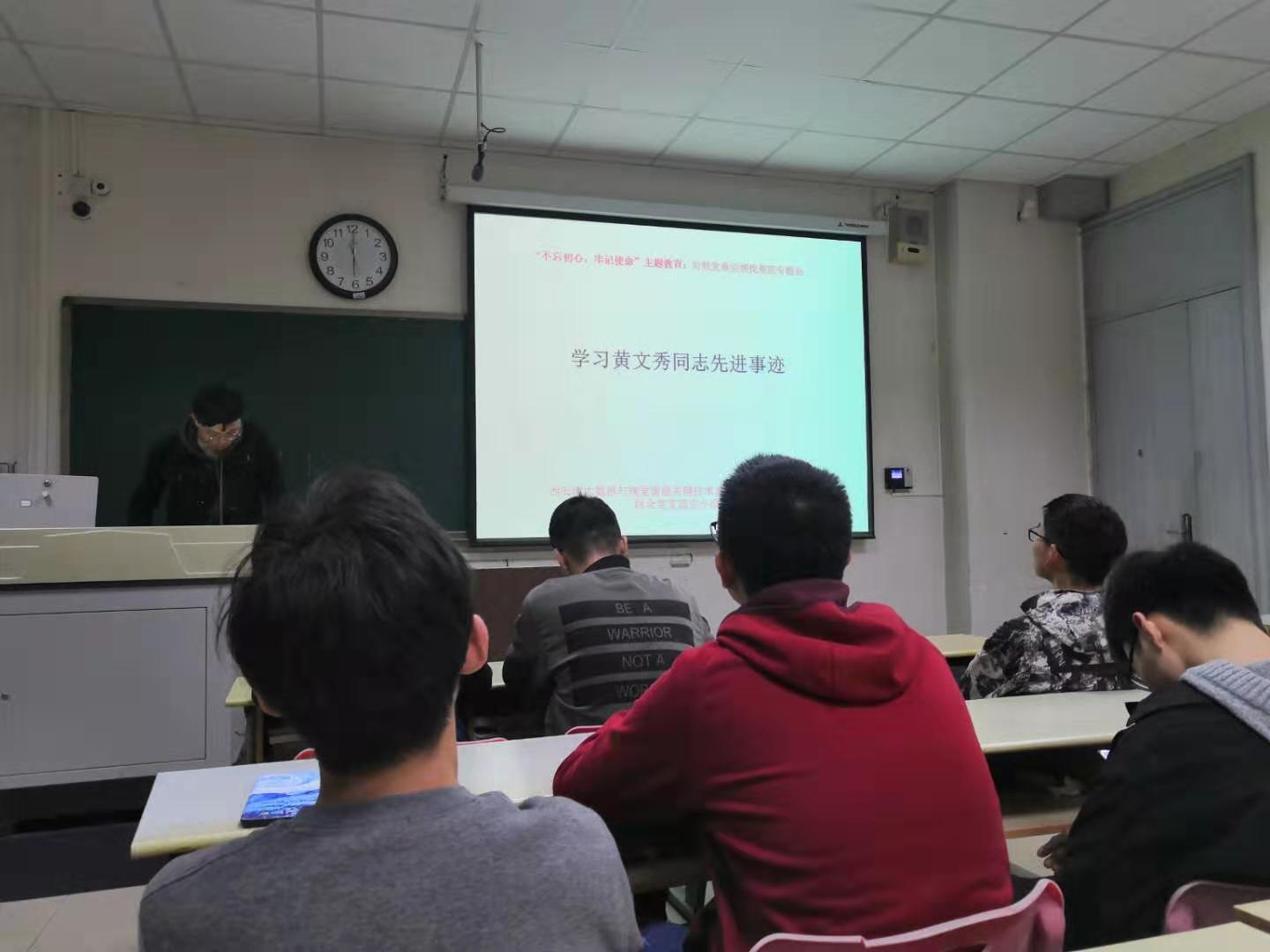 (通讯员 朱家成 赖腾 段金龙)为贯彻习近平总书记关于“不忘初心、牢记使命”主题教育的重要指示精神,学习“全国优秀党员”黄文秀同志的模范事迹,弘扬勇于担当、甘于奉献的革命精神,进一步提升党员党性修养,西安市大数据与视觉智能关键技术重点实验室本硕博师联合党支部于11月7日在北校区主楼四区225会议室举办了支部及党员对照党章党规找差距暨学习模范党员事迹主题教育活动。