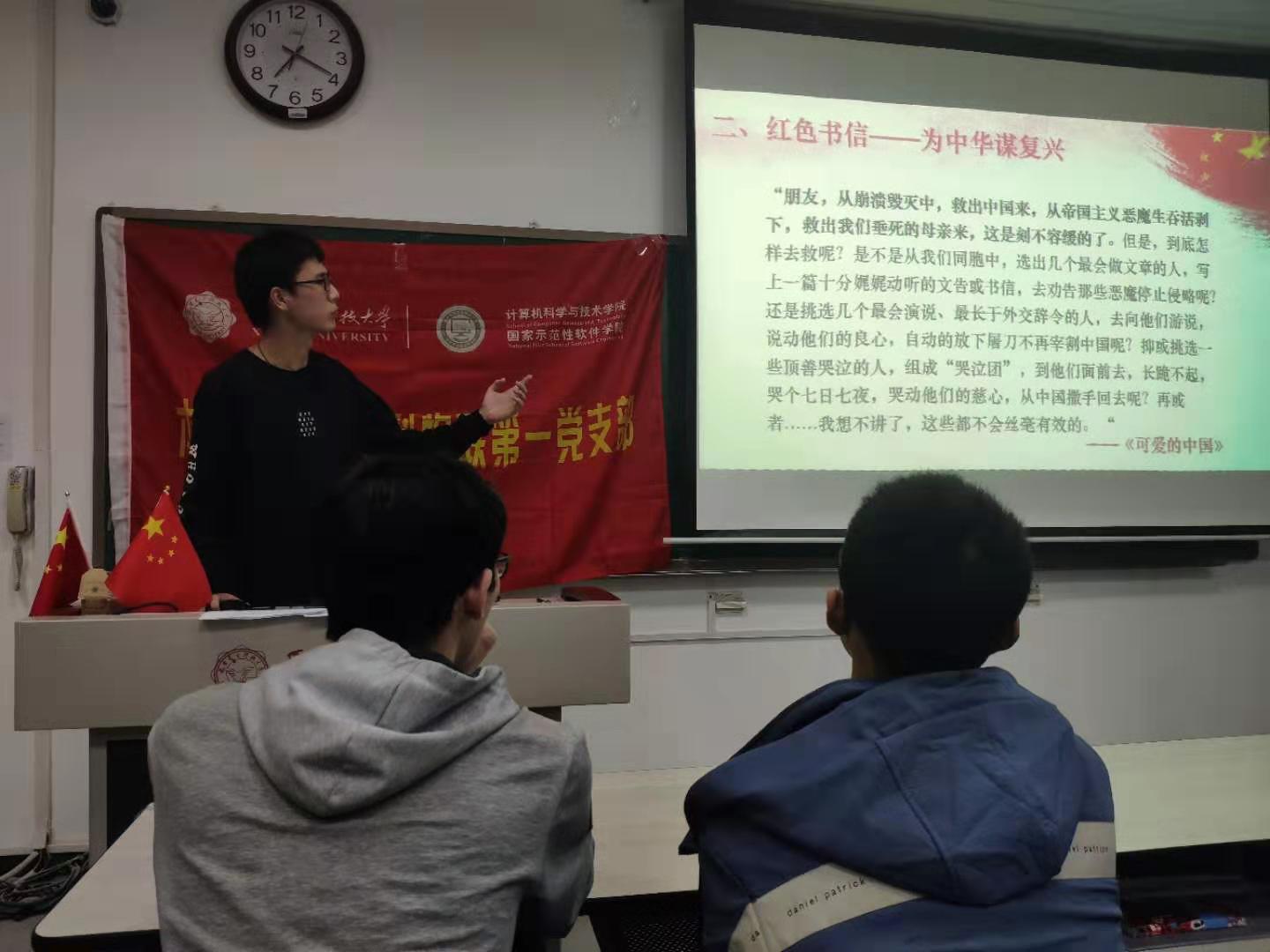 (通讯员 翟恋 徐聪)为感受共产党创业的筚路蓝缕,品鉴从风雨飘摇时代到现在的社会变迁,2019年11月3日晚,计科院本科2016级计科物联第一党支部在C楼324教室开展了“红色文化读物交流”主题党日活动,2016级辅导员郭禹宏老师及20余名支部成员参加了活动。