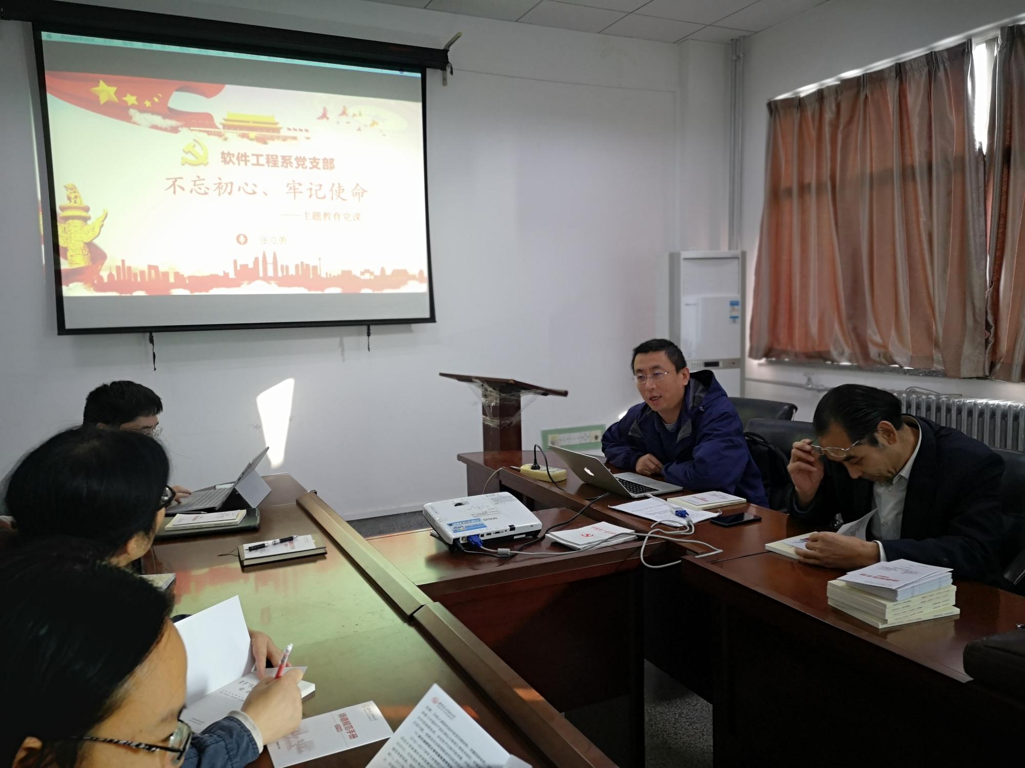首先,张立勇进行了以“不忘初心、牢记使命”为主题的党课,重点为与会教师解读了第二批“不忘初心、牢记使命”主题教育的要求及实施方案。第二批“不忘初心、牢记使命”主题教育要围绕学习贯彻习近平新时代中国特色社会主义思想这条主线,引导党员、干部原原本本学,以理论滋养初心、以理论引领使命,增强“四个意识”、坚定“四个自信”、做到“两个维护”。要突出问题导向;聚焦主题主线;要统筹推进四项重点措施;要上下联动抓好专项整治。最后,张立勇介绍了公司以及软件工程系党支部关于开展“不忘初心、牢记使命”主题教育的工作方案和工作计划,并强调每位教师党员都应正确把握高校教师的初心和使命,加强理想信念,做合格党员,当好员工的“四个引路人”、做“四有”好老师。