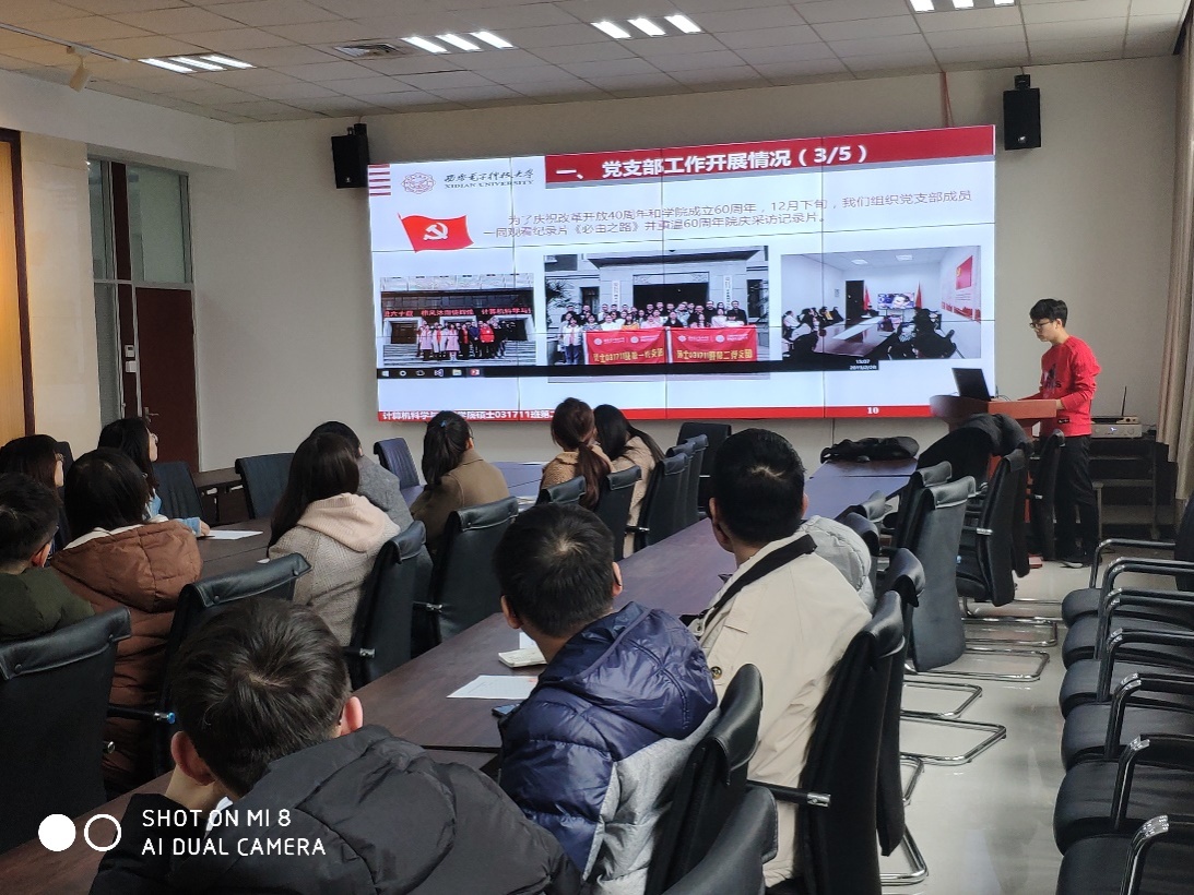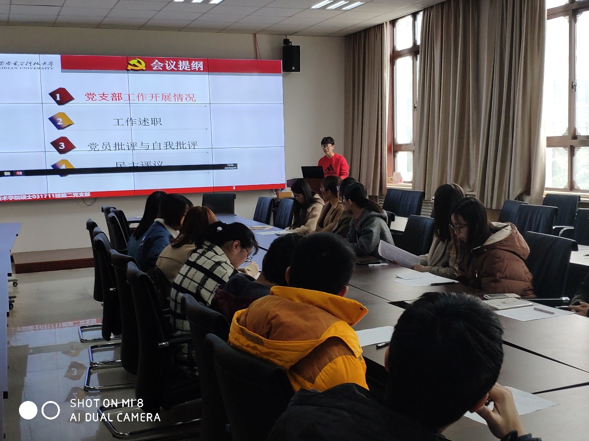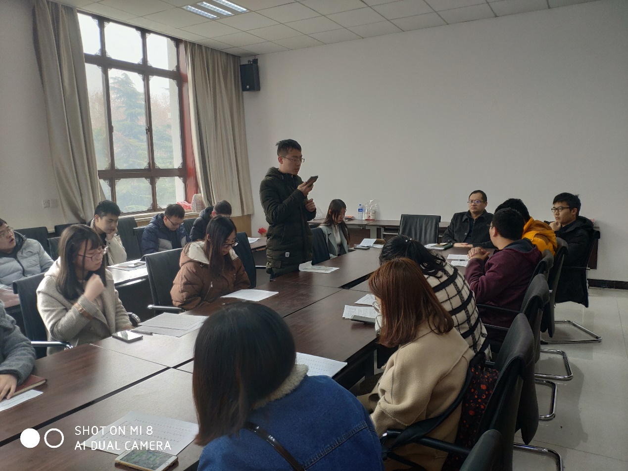 会议第一阶段,支部书记刘汪洋代表硕士031711班第二党支部总结了新支部成立以来开展的一系列活动,活动的主要形式包括:主题党日活动、党支部大会、党支部成员集体学习讨论、支部委员会以及“纪念改革开放40周年”等特色活动。接下来,支部书记刘汪洋代表硕士031711班第二党支部向全体党员大会述职,从基层组织建设、思想政治建设、系列党建活动、党员发展工作四个方面总结了2018年度硕士031711班第二党支部开展的主要工作和取得的成绩。同时,刘汪洋向党员大会汇报了公司党委对该支部2018年度工作的建议和意见,对2019年工作的新的部署和安排,并从“如何紧密联系群众”和“如何更好的发挥高校中基层党支部的战斗堡垒作用”两个角度陈述了过去的不足和今后进一步改进的目标。