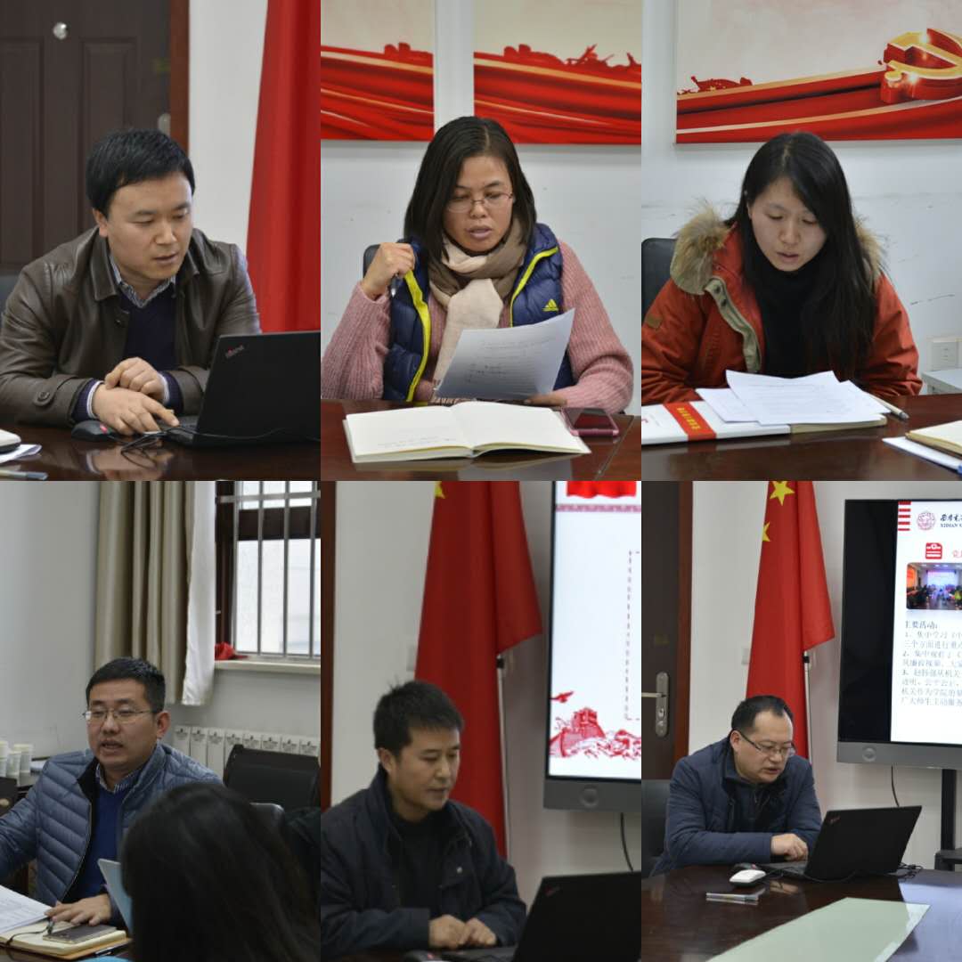 教职工支部的6位支部书记主要从常规学习、主题活动、党员发展等方面全面回顾了2018年下半年支部工作情况,对照工作实际提出了不足和差距,并给出了2019年支部工作的具体内容、路线图和时间表。其中,软件工程系支部书记宋胜利同志从学习重要讲话、贯彻党委要求、基层组织建设、三会一课学习、主题党日活动、党建业务融合等六个方面详细介绍了支部党建工作,并以党支部担负的职责为切入点,将2019年支部工作概括为党员工作和师生工作两个模块,并做详细说明。计算机工程系支部书记鱼亮同志以“抓好党建促教学”思想为指导,重点介绍了支部开展的主题党日活动。网络工程系支部副书记谢琨同志从支部学习、参观帮扶、校企交流、课程思政等方面回顾了支部工作进程。计算机科学系支部书记戚玉涛同志、实践教学中心支部书记杨力同志均谈到了需进一步突出特色、创新形式、增强支部活动吸引力。机关支部书记赵韩强同志从机关的服务职能入手,着重对支部开展的党风廉政建设专题学习进行了汇报。