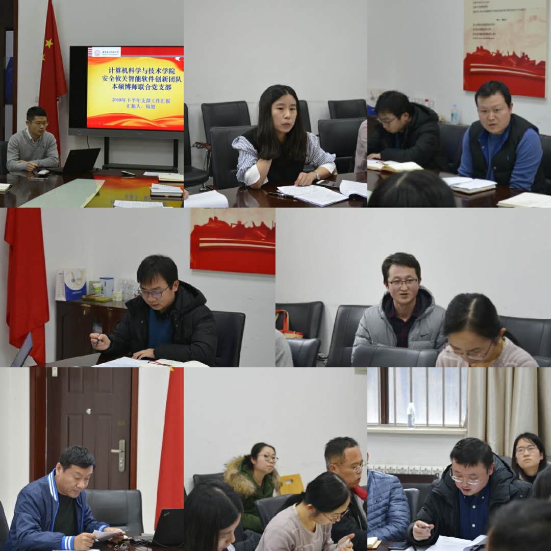 本硕博师支部的8位支部书记以“本硕博师贯通培养”的支部设置理念为思路,从党员构成、活动开展、党员发展等方面总结了2018年下半年支部工作,在认真查摆问题的基础上对2019年上半年工作思路和措施进行了汇报。安全攸关智能软件创新团队本硕博师联合支部书记陆旭同志谈到,随着支部博士生相继毕业,及时吸纳优秀员工加入支部是后续工作重点之一。软件系统工程省部级重点实验室本硕博师联合支部书记蔺一帅、计算机科学系本硕博师联合支部书记王炳波同志均认为,支部仍需进一步深入思考和不断实践,凝练本硕博师支部特色。陕西省网络与系统安全重点实验室本硕博师联合支部书记沈博同志说到,为吸引更多非党员同学加入支部,支委应提前谋划活动内容、创新活动形式。输入输出设备省部级重点实验室本硕博师联合支部罗楠同志针对党建与业务结合不够紧密的问题,在工作计划中按月设计了理论学习、支部研讨、主题实践等内容,以业务促党建、以党建抓业务。西安市大数据与视觉智能关键技术重点实验室本硕博师联合支部书记刘向增同志、计算机工程系本硕博师联合支部书记张琛同志均提到了支部联合开展主题活动的计划。软件工程系支部书记李瑞同志从实现党员社会价值的角度详细介绍了校企支部互动互学的思路。