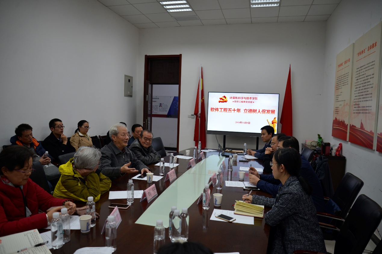 各位老教授和支部党员积极发言,为软件工程高质量人才培养建言献策。王力教授简要回顾了软件技术的发展脉络,刘坚教授从国家对自主可控软件发展的需要角度提出了软件工程人才培养的目标,徐学洲教授就学科发展给出了建议和意见,王亚平教授建议加强校企联合培养提升软件人才的工程技术能力。与会教师党员深受启发和鼓舞,纷纷就加强软件工程专业本科公司产品和提升软件人才培养质量谈了自己的体会和认识。