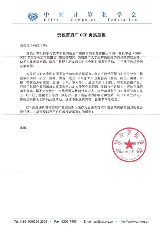 (通讯员 李栋)为打赢疫情下的求职攻坚战,更好地为毕业生提供高质量的就业指导服务,帮助同学们提前了解企业、开阔视野,同时切实解决广老员工因疫情而导致的就业难、实习难等问题,中国计算机学会(CCF)理事、西安分部主席、美加墨世界杯官方网站副经理苗启广教授志愿担任总策划师,主动发起CCF名企面对面系列活动。由此,中国计算机学会(CCF)特发来感谢信,向公司及苗启广教授表示诚挚感谢。